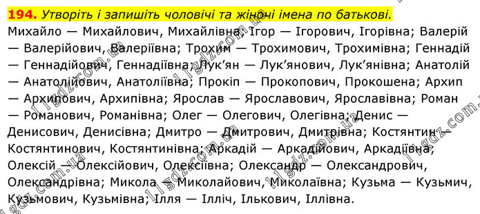 Утворіть і запишіть чоловічі та жіночі імена по батькові. Михайло — Михайлович, Михайлівна; Ігор — Ігорович, Ігорівна; Валерій — Валерійович, Валеріївна; Трохим — Трохимович, Трохимівна; Геннадій — Геннадійович, Геннадіївна; Лук’ян — Лук’янович, Лук’янівна; Анатолій — Анатолійович, Анатоліївна; Прокіп — Прокопович, Прокошена; Архип — Архипович, Архипівна; Ярослав — Ярославович, Ярославівна; Роман — Романович, Романівна; Олег — Олегович, Олегівна; Денис — Денисович, Денисівна; Дмитро — Дмитрович, Дмитрівна; Костянтин — Костянтинович, Костянтинівна; Аркадій — Аркадійович, Аркадіївна; Олексій — Олексійович, Олексіївна; Олександр — Олександрович, Олександрівна; Микола — Миколайович, Миколаївна; Кузьма — Кузьмич, Кузьмович, Кузьмівна; Ілля — Ілліч, Ількович, Іллівна.