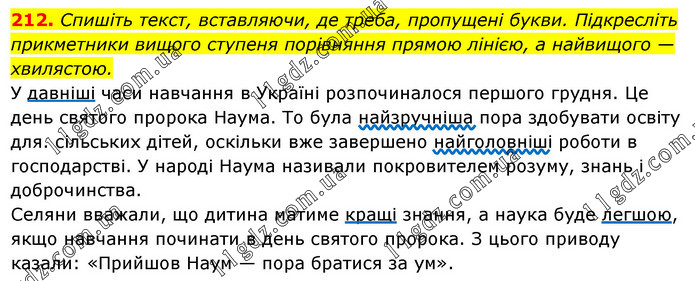 Спишіть текст, вставляючи, де треба, пропущені букви. Підкресліть прикметники вищого ступеня порівняння прямою лінією, а найвищого — хвилястою. У давніші часи навчання в Україні розпочиналося першого грудня. Це день святого пророка Наума. То була найзручніша пора здобувати освіту для. сільських дітей, оскільки вже завершено найголовніші роботи в господарстві. У народі Наума називали покровителем розуму, знань і доброчинства. Селяни вважали, що дитина матиме кращі знання, а наука буде легшою, якщо навчання починати в день святого пророка. З цього приводу казали: «Прийшов Наум — пора братися за ум».