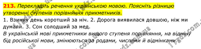 Перекладіть речення українською мовою. Поясніть різницю утворенні ступенів порівняння прикметників. 1. Взимку день коротший за ніч. 2. Дорога виявилася довшою, ніж ми думали. 3. Сон солодший за мед. В українській мові прикметники вищого ступеня порівняння, на відміну бід російської мови, змінюються за родами, числами й відмінками.