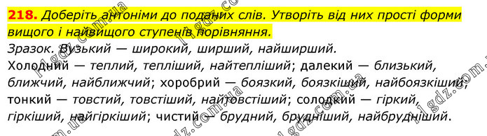 Доберіть антоніми до поданих слів. Утворіть від них прості форми вищого і найвищого ступенів порівняння. Зразок. Вузький — широкий, ширший, найширший. Холодний — теплий, тепліший, найтепліший; далекий — близький, ближчий, найближчий; хоробрий — боязкий, боязкіший, найбоязкіший; тонкий — товстий, товстіший, найтовстіший; солодкий — гіркий, гіркіший, найгіркіший; чистий — брудний, брудніший, найбрудніший.