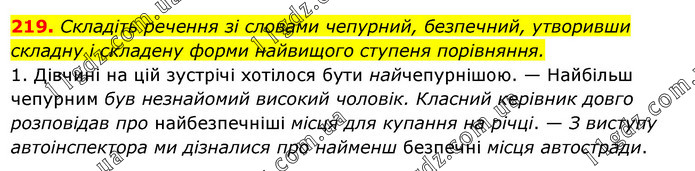 Складіть речення зі словами чепурний, безпечний, утворивши складну і складену форми найвищого ступеня порівняння. 1. Дівчині на цій зустрічі хотілося бути найчепурнішою. — Найбільш чепурним був незнайомий високий чоловік. Класний керівник довго розповідав про найбезпечніші місця для купання на річці. — З виступу автоінспектора ми дізналися про найменш безпечні місця автостради.