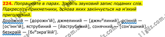 Попрацюйте в парах. Зробіть звуковий запис поданих слів. Підкресліть прикметники, основа яких закінчується на м'який приголосний. Дорожній — [дорожн’ій], джмелиний — [джме^Илиний], осінній — [ос’інн’ій], яструбиний — [йаструбиний], сонячний — [сон’ашний], безкраїй — [бе^Изкра’йій’].