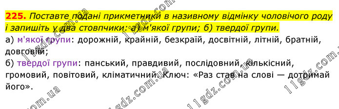 Поставте подані прикметники в називному відмінку чоловічого роду і запишіть у два стовпчики: а) м'якої групи; б) твердої групи. а) м'якої групи: дорожній, крайній, безкраїй, досвітній, літній, братній, довговіїй; б) твердої групи: панський, правдивий, послідовний, кількісний, громовий, повітовий, кліматичний. Ключ: «Раз став на слові — дотримай його».