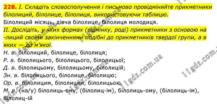 І. Складіть словосполучення і письмово провідміняйте прикметники білолиций, білолице, білолиця, використовуючи таблицю. Білолиций місяць, дівча білолице, білолиця молодиця. II. Дослідіть, у яких формах (відмінку, роді) прикметники з основою на -лиций своїми закінченнями подібні до прикметників твердої групи, а в яких — до м’якої. Н. в. білолиций, білолице, білолиця; Р. в. білолицього, білолицього, білолицьої; Д. в. білолицьому, білолицьому, білолицій; Зн. в. білолицього, білолице, білолицю; Ор. в. білолицим, білолицим, білолицьою. М. в. (на/у) білолиць-ому, (білолиц-ім), білолиць-ому, (білолиць-ім), білолиц-ій