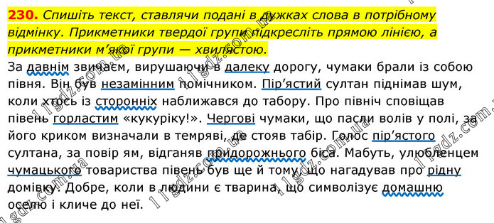 Спишіть текст, ставлячи подані в дужках слова в потрібному відмінку. Прикметники твердої групи підкресліть прямою лінією, а прикметники м’якої групи — хвилястою. За давнім звичаєм, вирушаючи в далеку дорогу, чумаки брали із собою півня. Він був незамінним помічником. Пір’ястий султан піднімав шум, коли хтось із сторонніх наближався до табору. Про північ сповіщав півень горластим «кукуріку!». Чергові чумаки, що пасли волів у полі, за його криком визначали в темряві, де стояв табір. Голос пір’ястого султана, за повір ям, відганяв придорожнього біса. Мабуть, улюбленцем чумацького товариства півень був ще й тому, що нагадував про рідну домівку. Добре, коли в людини є тварина, що символізує домашню оселю і кличе до неї.