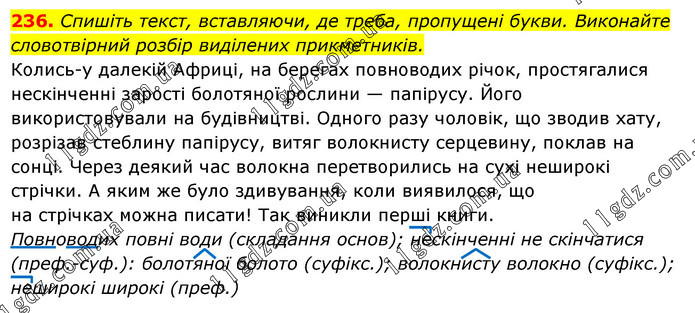Спишіть текст, вставляючи, де треба, пропущені букви. Виконайте словотвірний розбір виділених прикметників. Колись-у далекій Африці, на берегах повноводих річок, простягалися нескінченні зарості болотяної рослини — папірусу. Його використовували на будівництві. Одного разу чоловік, що зводив хату, розрізав стеблину папірусу, витяг волокнисту серцевину, поклав на сонці. Через деякий час волокна перетворились на сухі неширокі стрічки. А яким же було здивування, коли виявилося, що на стрічках можна писати! Так виникли перші книги. Повноводих повні води (складання основ); нескінченні не скінчатися (преф.-суф.): болотяної болото (суфікс.); волокнисту волокно (суфікс.); неширокі широкі (преф.)
