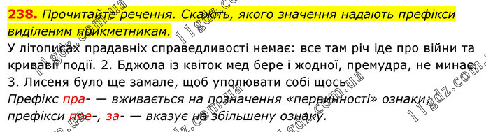 Прочитайте речення. Скажіть, якого значення надають префікси виділеним прикметникам. У літописах прадавніх справедливості немає: все там річ іде про війни та кривавії події. 2. Бджола із квіток мед бере і жодної, премудра, не минає. 3. Лисеня було ще замале, щоб уполювати собі щось. Префікс пра- — вживається на позначення «первинності» ознаки; префікси пре-, за- — вказує на збільшену ознаку.