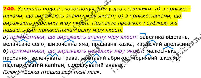 Запишіть подані словосполучення у два стовпчики: а) з прикмет-никами, що виражають значну міру якості; б) з прикметниками, що виражають невелику міру якості. Позначте префікси і суфікси, які надають цим прикметникам різну міру якості. в) прикметники, що виражають значну міру якості: завелика відстань, величезне село, широченна яма, прадавня казка, кислючий апельсин; б) прикметники, що виражають невелику міру якості: малюсіньке прохання, зеленувата трава, жовтавий абрикос, чорнявий школяр, підстаркуватий капітан, солодкуватий ананас. Ключ: «Всяка пташка свої пісні має».