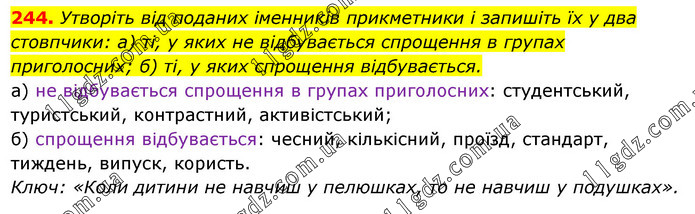 Утворіть від поданих іменників прикметники і запишіть їх у два стовпчики: а) ті, у яких не відбувається спрощення в групах приголосних; б) ті, у яких спрощення відбувається. а) не відбувається спрощення в групах приголосних: студентський, туристський, контрастний, активістський; б) спрощення відбувається: чесний, кількісний, проїзд, стандарт, тиждень, випуск, користь. Ключ: «Коли дитини не навчиш у пелюшках, то не навчиш у подушках»