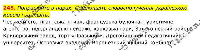 Попрацюйте в парах. Перекладіть словосполучення українською мовою і запишіть. Чеське місто, гігантська птиця, французька булочка, туристичне агентство, нідерландські пейзажі, кавказькі гори, Золотоніський район, Криворізький завод, торт «Празький», Дрогобицький педагогічний університет, Острозька академія, Воронезький хлібний комбінат.