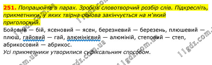 Попрацюйте в парах. Зробіть словотворчий розбір слів. Підкресліть, прикметники, у яких твірна основа закінчується на м'який приголосний. Бойовий — бій, ясеновий — ясен, березневий — березень, плюшевий — плюш, гайовий — гай, алюмінієвий — алюміній, степовий — степ, абрикосовий — абрикос. Усі прикметники утворилися суфіксальним способом.