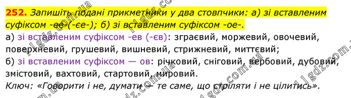 Запишіть подані прикметники у два стовпчики: а) зі вставленим суфіксом -ее-(-єе-); б) зі вставленим суфіксом -ое-. а) зі вставленим суфіксом -ев (-єв): зграєвий, моржевий, овочевий, поверхневий, грушевий, вишневий, стрижневий, миттєвий; б) зі вставленим суфіксом — ов: річковий, сніговий, вербовий, дубовий, змістовий, вахтовий, стартовий, мировий. Ключ: «Говорити і не, думати — те саме, що стріляти і не цілитись».