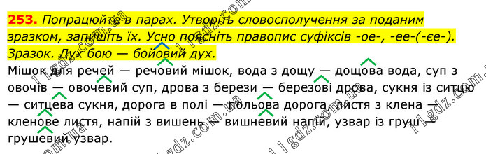 Попрацюйте в парах. Утворіть словосполучення за поданим зразком, запишіть їх. Усно поясніть правопис суфіксів -ое-, -ее-(-єе-). Зразок. Дух бою — бойовий дух. Мішок для речей — речовий мішок, вода з дощу — дощова вода, суп з овочів — овочевий суп, дрова з берези — березові дрова, сукня із ситцю — ситцева сукня, дорога в полі — польова дорога, листя з клена — кленове листя, напій з вишень — вишневий напій, узвар із груш — грушевий узвар.
