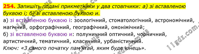 Запишіть подані прикметники у два стовпчики: а) зі вставленою буквою і; б) зі вставленою буквою и. а) зі вставленою буквою і: зоологічний, стоматологічний, астрономічний, магічний, орфографічний, географічний, омонімічний; б) зі вставленою буквою и: полуничний оптичний, чорничний, артистичний, тематичний, класичний, урбаністичний. Ключ: «3 самого початку пам’ятай, яким буде кінець».