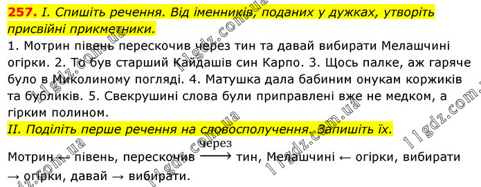 І. Спишіть речення. Від іменників, поданих у дужках, утворіть присвійні прикметники. 1. Мотрин півень перескочив через тин та давай вибирати Мелашчині огірки. 2. То був старший Кайдашів син Карпо. 3. Щось палке, аж гаряче було в Миколиному погляді. 4. Матушка дала бабиним онукам коржиків та бубликів. 5. Свекрушині слова були приправлені вже не медком, а гірким полином. II. Поділіть перше речення на словосполучення. Запишіть їх. Мотрин ← півень, перескочив □(→┴через ) тин, Мелашчині ← огірки, вибирати → огірки, давай → вибирати.