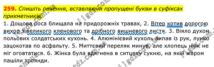 Спишіть речення, вставляючи пропущені букви в суфіксах прикметників. 1. Дощова роса блищала на придорожніх травах, 2. Вітер котив дорогою вихор з великого кленового та дрібного вишневого листя. 3. Віяло духом польових солдатських кухонь. 4. Алюмінієвий кухоль випав із рук, лунко зацокотав по асфальту. 5. Миттєвий переляк минув, але хлопець ніяк не міг оговтатися. 6. Жінка була вдягнена в ситцеву сукню, на якій жаром пашіли троянди.