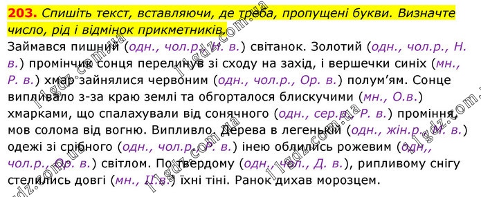 Спишіть текст, вставляючи, де треба, пропущені букви. Визначте число, рід і відмінок прикметників. Займався пишний (одн., чол.р., Н. в.) світанок. Золотий (одн., чол.р., Н. в.) промінчик сонця перелинув зі сходу на захід, і вершечки синіх (мн., Р. в.) хмар зайнялися червоним (одн., чол.р., Ор. в.) полум’ям. Сонце випливало з-за краю землі та обгорталося блискучими (мн., O.в.) хмарками, що спалахували від сонячного (одн., сер.р., Р. в.) проміння, мов солома від вогню. Випливло. Дерева в легенькій (одн., жін.р., М. в.) одежі зі срібного (одн., чол.р., Р. в.) інею облились рожевим (одн,, чол.р., Ор. в.) світлом. По твердому (одн., чол., Д. в.), рипливому снігу стелились довгі (мн., II.в.) їхні тіні. Ранок дихав морозцем.