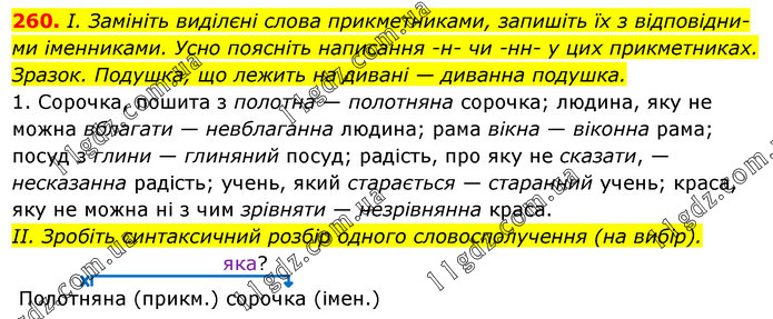 І. Замініть виділєні слова прикметниками, запишіть їх з відповідни-ми іменниками. Усно поясніть написання -н- чи -нн- у цих прикметниках. Зразок. Подушка, що лежить на дивані — диванна подушка. 1. Сорочка, пошита з полотна — полотняна сорочка; людина, яку не можна вблагати — невблаганна людина; рама вікна — віконна рама; посуд з глини — глиняний посуд; радість, про яку не сказати, — несказанна радість; учень, який старається — старанний учень; краса, яку не можна ні з чим зрівняти — незрівнянна краса. ІІ. Зробіть синтаксичний розбір одного словосполучення (на вибір). яка? Полотняна (прикм.) сорочка (імен.)