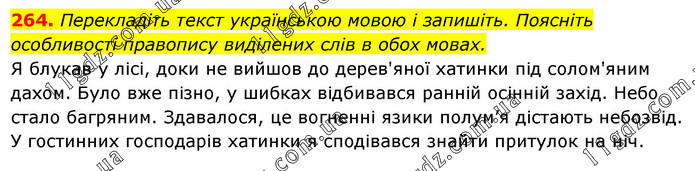 Перекладіть текст українською мовою і запишіть. Поясніть особливості правопису виділених слів в обох мовах. Я блукав у лісі, доки не вийшов до дерев'яної хатинки під солом'яним дахом. Було вже пізно, у шибках відбивався ранній осінній захід. Небо стало багряним. Здавалося, це вогненні язики полум’я дістають небозвід. У гостинних господарів хатинки я сподівався знайти притулок на ніч.