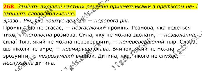 Замініть виділені частини речення прикметниками з префіксом не- і запишіть словосполучення. Зразо . Річ, яка коштує дешево — недорога річ. Промінь, що не згасає, — незгасаючий промінь. Розмова, яка ведеться тихо, — неголосна розмова. Сила, яку не можна здолати, — нездоланна сила. Твір, який не можна перевершити, — неперевершений твір. Слава, що ніколи не вмре, — невмируща слава. Вчинок, який не можна зрозуміти, — незрозумілий вчинок. Дитина, яка, нікого не слухає, — неслухняна дитина.