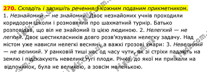 Складіть і запишіть речення з кожним поданим прикметником. 1. Незнайомий — не знайомий. Двоє незнайомих учнів проходили коридором школи і розмовляли про шахматний турнір. Батько розповідав, що віл не знайомий із цією людиною. 2. Нелегкий — не легкий. Двоє шестикласників довго розв’язували нелегку задачу. Над містом уже нависли нелегкі весняні, а важкі грозові хмари: 3. Невеликий — не великий. У ранковій тиші час од часу чути, як зі стріхи падають на землю і підскакують невеликі тугі плоди. Річка, до якої ми приїхали на відпочинок, була не великою, а зовсім маленькою.