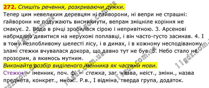 Спишіть речення, розкриваючи дужки. Тепер цим невеликим деревцям ні гайворони, ні вепри не страшні: гайворони не подужають висмикнути, вепрам зміцніле коріння не смакує. 2. Вода в річці зробилася сірою і непривітною. 3. Арсенові набридало дивитися на нерухомі поплавці, і він часто-густо засинав. 4. І в тому незлобливому шелесті лісу, і в димах, і в кожному несподіваному зламі стежки вчувалася докора, що давно тут не був. 5. Небо стало не прозорим, а якимось мутним. Виконайте розбір виділеного іменника як частини мови. Стежки — іменник, поч. ф. — стежка, заг. назва, неіст., змінн., назва предмета, конкрет., множ.. P.в., І відміна, тверда група, додаток.