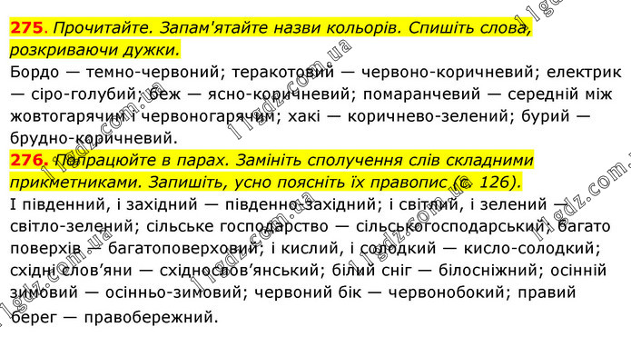 275. Прочитайте. Запам'ятайте назви кольорів. Спишіть слова, розкриваючи дужки. Бордо — темно-червоний; теракотовий — червоно-коричневий; електрик — сіро-голубий; беж — ясно-коричневий; помаранчевий — середній між жовтогарячим і червоногарячим; хакі — коричнево-зелений; бурий — брудно-коричневий. 276. Попрацюйте в парах. Замініть сполучення слів складними прикметниками. Запишіть, усно поясніть їх правопис (с. 126). І південний, і західний — південно-західний; і світлий, і зелений — світло-зелений; сільське господарство — сільськогосподарський; багато поверхів — багатоповерховий; і кислий, і солодкий — кисло-солодкий; східні слов’яни — східнослов’янський; білий сніг — білосніжний; осінній зимовий — осінньо-зимовий; червоний бік — червонобокий; правий берег — правобережний.