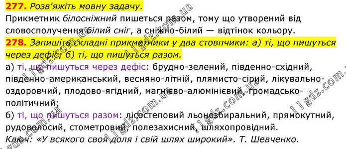 277. Розв'яжіть мовну задачу. Прикметник білосніжний пишеться разом, тому що утворений від словосполучення білий сніг, а сніжно-білий — відтінок кольору. 278. Запишіть складні прикметники у два стовпчики: а) ті, що пишуться через дефіс; б) ті, що пишуться разом. а) ті, що пишуться через дефіс: брудно-зелений, південно-східний, південно-американський, весняно-літній, плямисто-сірий, лікувально-оздоровчий, плодово-ягідний, магнієво-алюмінієвий, громадсько-політичний; б) ті, що пишуться разом: лісостеповий льонозбиральний, прямокутний, рудоволосий, стометровий, полезахисний, шляхопровідний. Ключ: «У всякого своя доля і свій шлях широкий». Т. Шевченко.