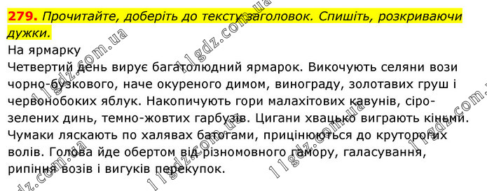 Прочитайте, доберіть до тексту заголовок. Спишіть, розкриваючи дужки. На ярмарку Четвертий день вирує багатолюдний ярмарок. Викочують селяни вози чорно-бузкового, наче окуреного димом, винограду, золотавих груш і червонобоких яблук. Накопичують гори малахітових кавунів, сіро-зелених динь, темно-жовтих гарбузів. Цигани хвацько виграють кіньми. Чумаки ляскають по халявах батогами, прицінюються до круторогих волів. Голова йде обертом від різномовного гамору, галасування, рипіння возів і вигуків перекупок.