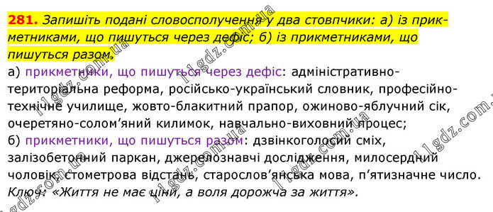 Запишіть подані словосполучення у два стовпчики: а) із прик-метниками, що пишуться через дефіс; б) із прикметниками, що пишуться разом. а) прикметники, що пишуться через дефіс: адміністративно-територіальна реформа, російсько-український словник, професійно-технічне училище, жовто-блакитний прапор, ожиново-яблучний сік, очеретяно-солом’яний килимок, навчально-виховний процес; б) прикметники, що пишуться разом: дзвінкоголосий сміх, залізобетонний паркан, джерелознавчі дослідження, милосердний чоловік, стометрова відстань, старослов’янська мова, п’ятизначне число. Ключ: «Життя не має ціни, а воля дорожча за життя».