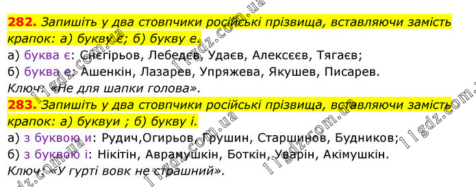 282. Запишіть у два стовпчики російські прізвища, вставляючи замість крапок: а) букву є; б) букву е. а) буква є: Снєгірьов, Лебедєв, Удаєв, Алексєєв, Тягаєв; б) буква е: Ашенкін, Лазарев, Упряжева, Якушев, Писарев. Ключ: «Не для шапки голова». 283. Запишіть у два стовпчики російські прізвища, вставляючи замість крапок: а) буквуи ; б) букву і. а) з буквою и: Рудич,Огирьов, Грушин, Старшинов, Будников; б) з буквою і: Нікітін, Аврамушкін, Боткін, Уварін, Акімушкін. Ключ: «У гурті вовк не страшний».