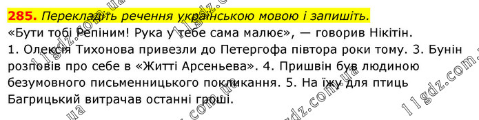 Перекладіть речення українською мовою і запишіть. «Бути тобі Репіним! Рука у тебе сама малює», — говорив Нікітін. 1. Олексія Тихонова привезли до Петергофа півтора роки тому. 3. Бунін розповів про себе в «Житті Арсеньева». 4. Пришвін був людиною безумовного письменницького покликання. 5. На їжу для птиць Багрицький витрачав останні гроші.