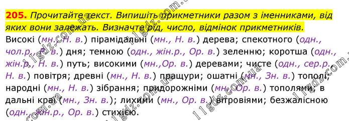 Прочитайте текст. Випишіть прикметники разом з іменниками, від яких вони залежать. Визначте рід, число, відмінок прикметників. Високі (мн., Н. в.) пірамідальні (мн., Н. в.) дерева; спекотного (одн., чол.р., Р. в.) дня; темною (одн., жін.р., Ор. в.) зеленню; коротша (одн., жін.р., Н. в.) путь; високими (мн.,Ор. в.) деревами; чисте (одн., сер.р., Н. в.) повітря; древні (мн., Н. в.) пращури; ошатні (мн., Зн. в.) тополі; народні (мн., Н. в.) зібрання; придорожніми (мн., Ор. в.) тополями; в дальні краї (мн., Зн. в.); лихими (мн., Ор. в.) вітровіями; безжалісною (одн., жін.р., Ор. в.) стихією.