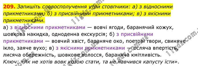 Запишіть словосполучення утри стовпчики: а) з відносними прикметниками; б) з присвійними прикметниками; в) з якісними прикметниками. а) з відносними прикметниками — вовчі ягоди, баранячий кожух, шовкова накидка, одноденна екскурсія; б) з присвійними прикметниками — вовчий хвіст, бараняче око, поетові твори, свиняче ікло, заяче вухо; в) з якісними прикметниками — осляча впертість, лисяча обережність, шовкове волосся, бараняча кмітливість. Ключ: «Як не хотів вовк козою стати, та не навчився капусту їсти».