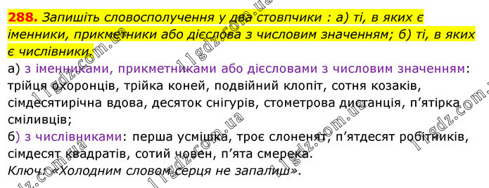 Запишіть словосполучення у два стовпчики : а) ті, в яких є іменники, прикметники або дієслова з числовим значенням; б) ті, в яких є числівники. а) з іменниками, прикметниками або дієсловами з числовим значенням: трійця охоронців, трійка коней, подвійний клопіт, сотня козаків, сімдесятирічна вдова, десяток снігурів, стометрова дистанція, п’ятірка сміливців; б) з числівниками: перша усмішка, троє слоненят, п’ятдесят робітників, сімдесят квадратів, сотий човен, п’ята смерека. Ключ: «Холодним словом серця не запалиш».