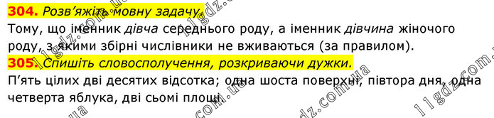 304. Розв’яжіть мовну задачу. Тому, що іменник дівча середнього роду, а іменник дівчина жіночого роду, з якими збірні числівники не вживаються (за правилом). 305. Спишіть словосполучення, розкриваючи дужки. П’ять цілих дві десятих відсотка; одна шоста поверхні, півтора дня, одна четверта яблука, дві сьомі площі.
