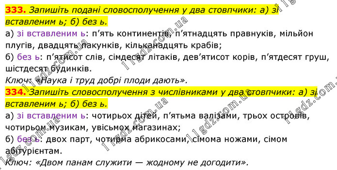 333. Запишіть подані словосполучення у два стовпчики: а) зі вставленим ь; б) без ь. а) зі вставленим ь: п’ять континентів, п’ятнадцять правнуків, мільйон плугів, двадцять пакунків, кільканадцять крабів; б) без ь: п’ятисот слів, сімдесят літаків, дев’ятисот корів, п’ятдесят груш, шістдесят будинків. Ключ: «Наука і труд добрі плоди дають». 334. Запишіть словосполучення з числівниками у два стовпчики: а) зі вставленим ь; б) без ь. а) зі вставленим ь: чотирьох дітей, п’ятьма валізами, трьох островів, чотирьом музикам, увісьмох магазинах; б) без ь: двох парт, чотирма абрикосами, сімома ножами, сімом абітурієнтам. Ключ: «Двом панам служити — жодному не догодити».