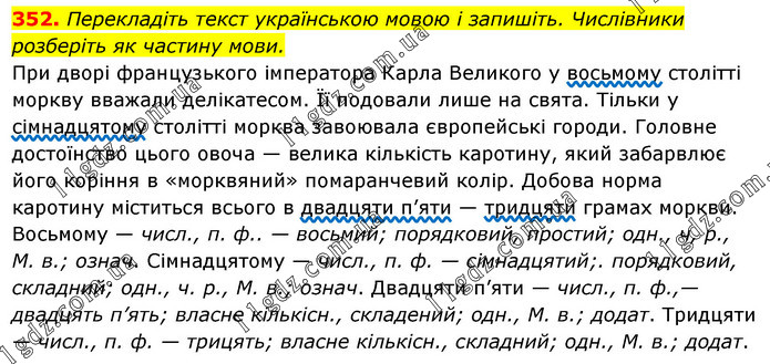 Перекладіть текст українською мовою і запишіть. Числівники розберіть як частину мови. При дворі французького імператора Карла Великого у восьмому столітті моркву вважали делікатесом. Її подовали лише на свята. Тільки у сімнадцятому столітті морква завоювала європейські городи. Головне достоїнство цього овоча — велика кількість каротину, який забарвлює його коріння в «морквяний» помаранчевий колір. Добова норма каротину міститься всього в двадцяти п’яти — тридцяти грамах моркви. Восьмому — числ., п. ф.. — восьмий; порядковий, простий; одн., ч, р., М. в.; означ. Сімнадцятому — числ., п. ф. — сімнадцятий;. порядковий, складний; одн., ч. р., М. в.; означ. Двадцяти п’яти — числ., п. ф.,— двадцять п’ять; власне кількісн., складений; одн., М. в.; додат. Тридцяти — числ., п. ф. — трицять; власне кількісн., складний; одн., М. в.; додат.