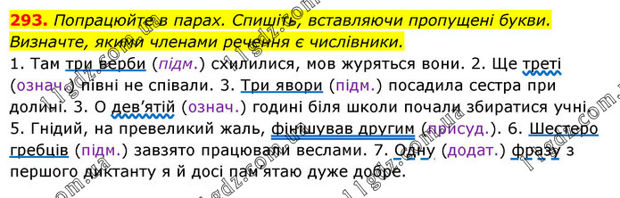 Попрацюйте в парах. Спишіть, вставляючи пропущені букви. Визначте, якими членами речення є числівники. 1. Там три верби (підм.) схилилися, мов журяться вони. 2. Ще треті (означ.) півні не співали. 3. Три явори (підм.) посадила сестра при долині. 3. О дев’ятій (означ.) годині біля школи почали збиратися учні. 5. Гнідий, на превеликий жаль, фінішував другим (присуд.). 6. Шестеро гребців (підм.) завзято працювали веслами. 7. Одну (додат.) фразу з першого диктанту я й досі пам’ятаю дуже добре.