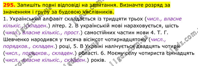 Запишіть повні відповіді на запитання. Визначте розряд за значенням і групу за будовою числівників. 1. Український алфавіт складається із тридцяти трьох (числ., власне кількіс., складен.) літер. 2. В українській мові нараховується, шість (числ., власне кількіс., прост.) самостійних частин мови 4. Т. Г. Шевченко народився у тисяча вісімсот чотирнадцятому (числ., порядков., складен.) році, 5. В Україні налічується двадцять чотири (числ., порядков., складен.) області. 6. Моєму селу чотириста сімнадцять (числ., власне кількіс., складен.) років.