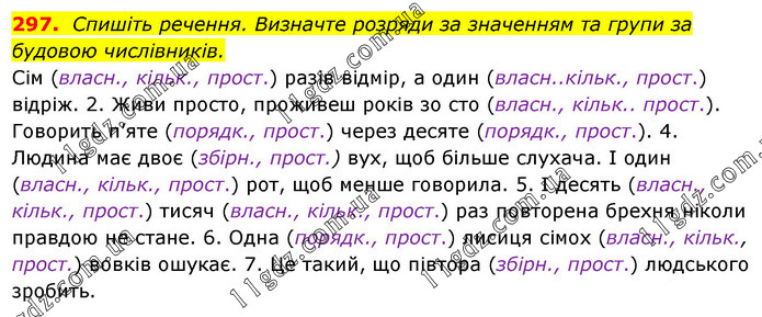 Спишіть речення. Визначте розряди за значенням та групи за будовою числівників. Сім (власн., кільк., прост.) разів відмір, а один (власн..кільк., прост.) відріж. 2. Живи просто, проживеш років зо сто (власн., кільк.. прост.). Говорить п’яте (порядк., прост.) через десяте (порядк., прост.). 4. Людина має двоє (збірн., прост.) вух, щоб більше слухача. І один (власн., кільк., прост.) рот, щоб менше говорила. 5. І десять (власн., кільк., прост.) тисяч (власн., кільк., прост.) раз повторена брехня ніколи правдою не стане. 6. Одна (порядк., прост.) лисиця сімох (власн., кільк., прост.) вовків ошукає. 7. Це такий, що півтора (збірн., прост.) людського зробить.