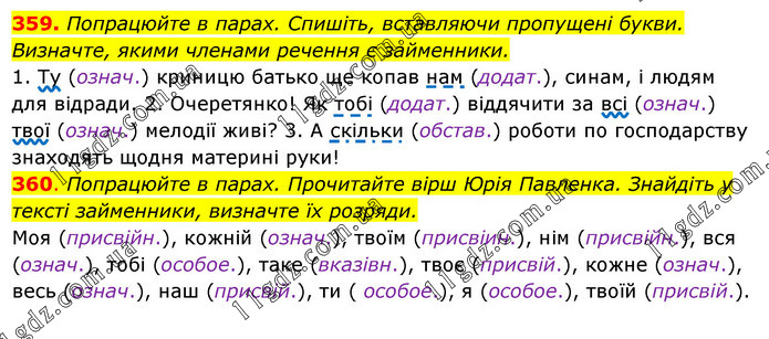 359. Попрацюйте в парах. Спишіть, вставляючи пропущені букви. Визначте, якими членами речення є займенники. 1. Ту (означ.) криницю батько ще копав нам (додат.), синам, і людям для відради. 2. Очеретянко! Як тобі (додат.) віддячити за всі (означ.) твої (означ.) мелодії живі? 3. А скільки (обстав.) роботи по господарству знаходять щодня материні руки! 360. Попрацюйте в парах. Прочитайте вірш Юрія Павленка. Знайдіть у тексті займенники, визначте їх розряди. Моя (присвійн.), кожній (означ.), твоїм (присвіин.), нім (присвійн.), вся (означ.), тобі (особое.), таке (вказівн.), твоє (присвій.), кожне (означ.), весь (означ.), наш (присвій.), ти ( особое.), я (особое.), твоїй (присвій.).