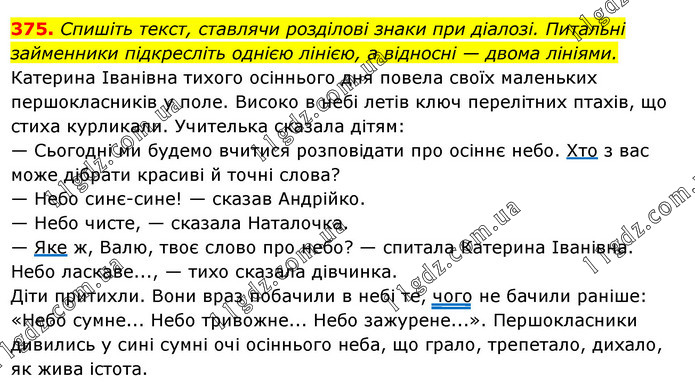Спишіть текст, ставлячи розділові знаки при діалозі. Питальні займенники підкресліть однією лінією, а відносні — двома лініями. Катерина Іванівна тихого осіннього дня повела своїх маленьких першокласників у поле. Високо в небі летів ключ перелітних птахів, що стиха курликали. Учителька сказала дітям: — Сьогодні ми будемо вчитися розповідати про осіннє небо. Хто з вас може дібрати красиві й точні слова? — Небо синє-сине! — сказав Андрійко. — Небо чисте, — сказала Наталочка. — Яке ж, Валю, твоє слово про небо? — спитала Катерина Іванівна. Небо ласкаве..., — тихо сказала дівчинка. Діти притихли. Вони враз побачили в небі те, чого не бачили раніше: «Небо сумне... Небо тривожне... Небо зажурене...». Першокласники дивились у сині сумні очі осіннього неба, що грало, трепетало, дихало, як жива істота.