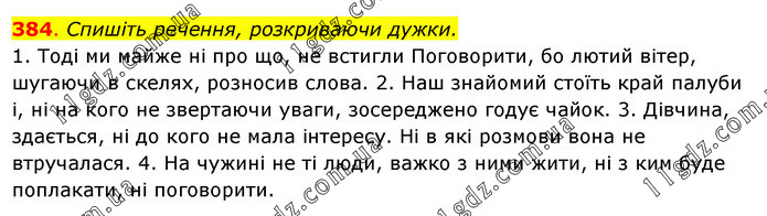 Спишіть речення, розкриваючи дужки. 1. Тоді ми майже ні про що, не встигли Поговорити, бо лютий вітер, шугаючи в скелях, розносив слова. 2. Наш знайомий стоїть край палуби і, ні на кого не звертаючи уваги, зосереджено годує чайок. 3. Дівчина, здається, ні до кого не мала інтересу. Ні в які розмови вона не втручалася. 4. На чужині не ті люди, важко з ними жити, ні з ким буде поплакати, ні поговорити.