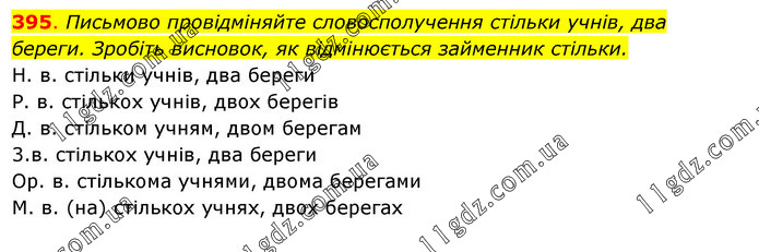 Письмово провідміняйте словосполучення стільки учнів, два береги. Зробіть висновок, як відмінюється займенник стільки. Н. в. стільки учнів, два береги Р. в. стількох учнів, двох берегів Д. в. стільком учням, двом берегам 3.в. стількох учнів, два береги Ор. в. стількома учнями, двома берегами М. в. (на) стількох учнях, двох берегах
