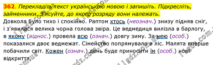 Перекладіть текст українською мовою і запишіть. Підкресліть, займенники. З'ясуйте, до якого розряду вони належать. Довкола було тихо і спокійно. Раптом хтось (неознач.) знизу підняв сніг, і з'явилася велика чорна голова звіра. Це ведмедиця вилізла в барлогу, в якому (віднос.) провела всю (означ.) довгу зиму. За нею (особ.) показалися двоє ведмежат. Сімейство попрямувало в ліс. Малята вперше побачили світ. Кожен (означ.) день буде приносити їм (особ.) нові відкриття.