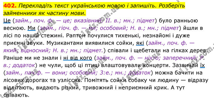 Перекладіть текст українською мовою і запишіть. Розберіть займенники як частину мови. Це (займ., поч. ф. — це; вказівний; II. в.; мн.; підмет) було ранньою весною. Ми (займ., гіоч. ф. — ми; особовий; Н. в.; мн.; підмет) йшли в лісі по нашій стежині. Раптом почулися тихенькі, незнайомі і дуже приємні звуки. Музикантами виявилися сойки, які (займ., поч. ф. — який; відносний; Н. в.; мн.; підмет.) співали і щебетали на гілках дерев. Раніше ми не знали і ні від кого (займ., поч. ф. — ніхто; заперечний; Р. в.; додаток) не чули, щоб ці птиці влаштовували концерти. Зазвичай їх (займ., пач.ф. — вони; особовий; 3:е.; мн.; додаток) можна бачити на лісових дорогах та узліссях. Помітять сойки собаку чи людину — відразу відлітають, видають різкий, тривожний і неприємний крик. А тут співають.
