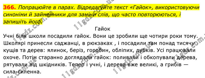 Попрацюйте в парах. Відредагуйте текст «Гайок», використовуючи синоніми й займенники для заміни слів, що часто повторюються, і запишіть його. Гайок Учні біля школи посадили гайок. Вони це зробили ще чотири роки тому. Школярі принесли саджанці, в рюкзаках , і посадили там понад тисячу кущів та дерев: ялинок, беріз, горобин, обліпих, дубків. Усі працювали охоче. Потім старанно доглядали гайок: поливали і обкопували дерева, рятували від шкідників. Тепер і учні, і дерева вже великі, а грибів — сила-силенна.