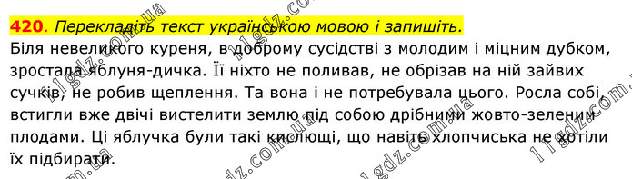 Перекладіть текст українською мовою і запишіть. Біля невеликого куреня, в доброму сусідстві з молодим і міцним дубком, зростала яблуня-дичка. Її ніхто не поливав, не обрізав на ній зайвих сучків, не робив щеплення. Та вона і не потребувала цього. Росла собі, встигли вже двічі вистелити землю під собою дрібними жовто-зеленим плодами. Ці яблучка були такі кислющі, що навіть хлопчиська не хотіли їх підбирати.