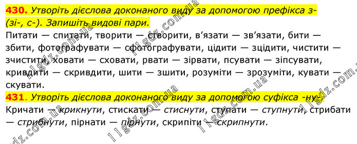 430. Утворіть дієслова доконаного виду за допомогою префікса з- (зі-, с-). Запишіть видові пари. Питати — спитати, творити — створити, в’язати — зв’язати, бити — збити, фотографувати — сфотографувати, цідити — зцідити, чистити — зчистити, ховати — сховати, рвати — зірвати, псувати — зіпсувати, кривдити — скривдити, шити — зшити, розуміти — зрозуміти, кувати — скувати. 431. Утворіть дієслова доконаного виду за допомогою суфікса -ну-. Кричати — крикнути, стискати — стиснути, ступати — ступнути, стрибати — стрибнути, пірнати — пірнути, скрипіти — скрипнути.